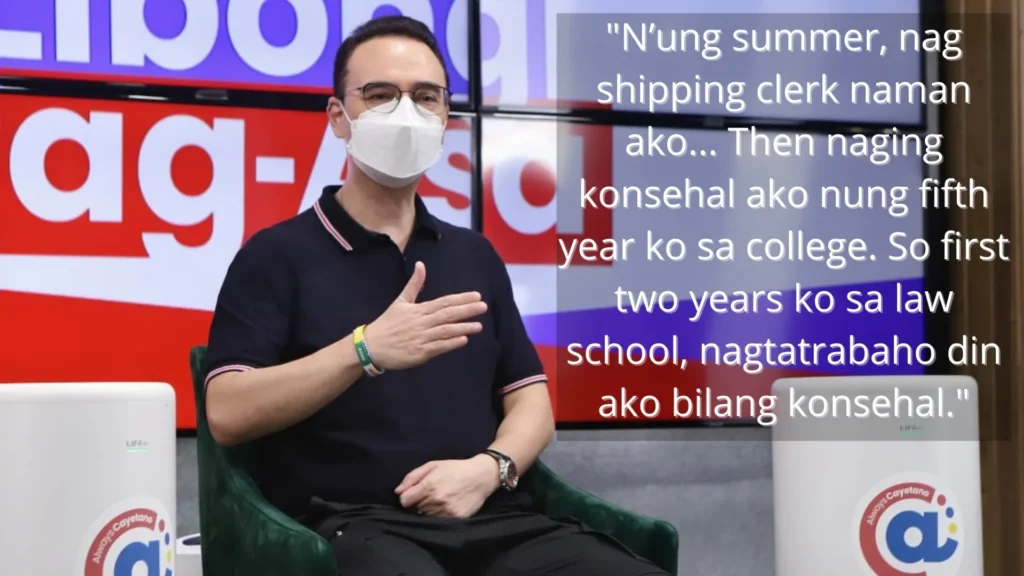Cayetano said he himself was a working student in college, starting out as a student assistant with a P5 to P6 per hour allowance. One summer he worked as a shipping clerk, and in law school, when he was elected councilor, he worked as a legislator.